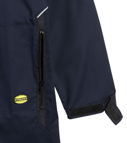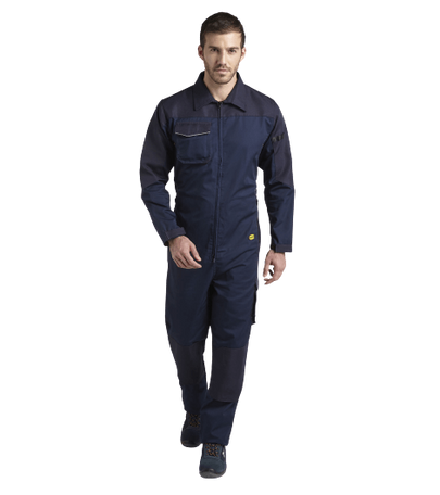 Overalls with contrast canvas details in abrasion-resistant polyester on shoulders, elbows and knees, two-way zip. Hammer holder and tape measure holder pockets, side pockets, elasticated detail on back to facilitate movement, elasticated waist, reflective details, badge holder, triple stitching